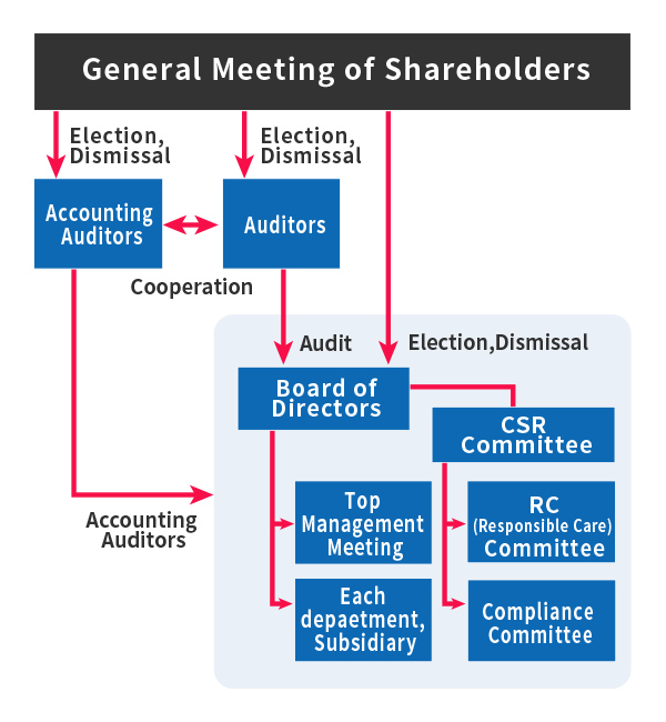 The CSR Committee, held twice a year, is chaired by the President & CEO, comprised of Division Directors, Executives, and other members. At the meetings, members discuss measures to cultivate and improve a corporate culture that encourages company-wide efforts in CSR activities from the viewpoints of reinforcing legal compliance, responsible care, and social contribution, among others.